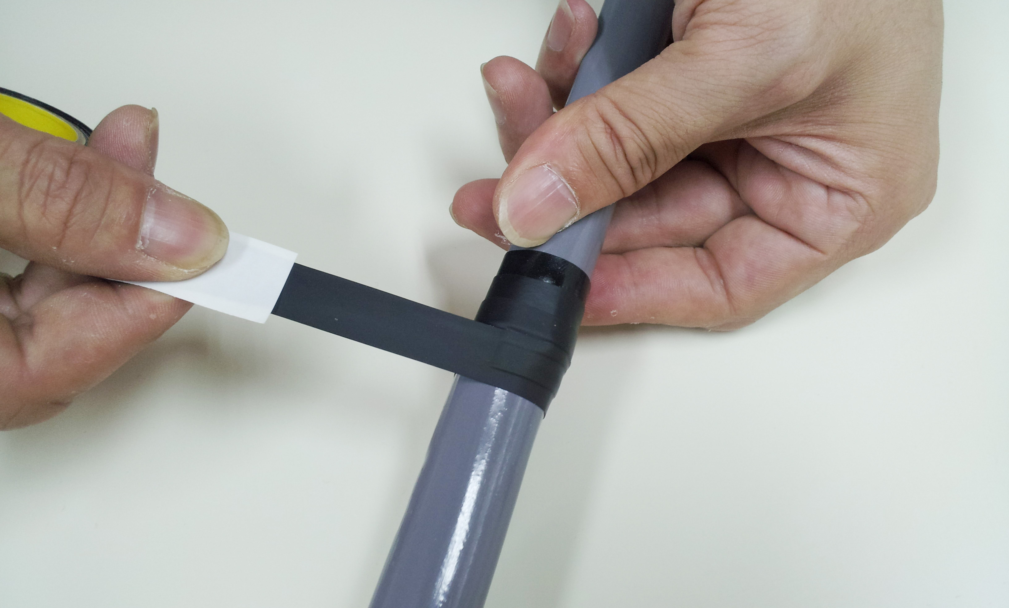 白い保護フィルムをはがし、テープを引き延ばし(約2~2.5倍)ながら丁寧に巻き付けます。この時テープ幅の半分ずつ重なるように巻いてください。テープ巻きの際は気泡が入らないように注意してください。巻き終わりは張力を戻し、軽く指で押さえて巻き止めします。そのあと、全体に手で圧力を加え、融着を促進させてください。